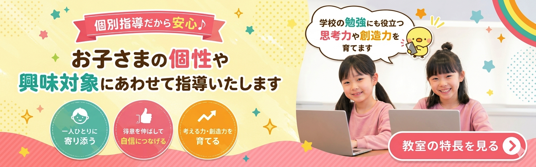 - ひとりひとりの個性、興味対象や目標に合わせた学習プランをご提案。また個別指導ですので、周りとペースが合わないという心配もありません