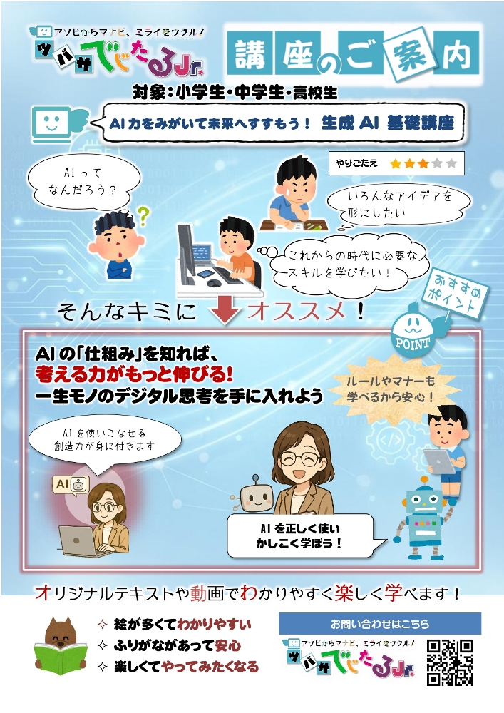 本講座では、AIが得意なこと・苦手なことを学び、デジタルの世界を安全に歩むための知識を育みます。。